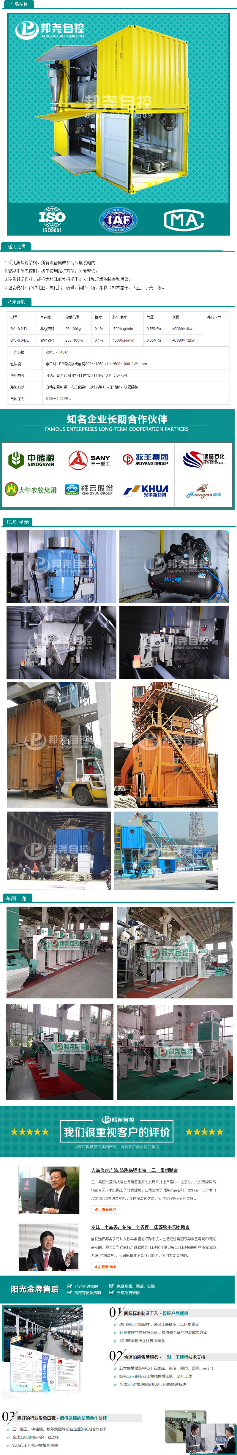 采用集裝箱結(jié)構(gòu),所有設(shè)備集成在兩只集裝箱內(nèi)。 智能化儀表控制,操作使用維護(hù)方便,故障率低。 設(shè)備封閉作業(yè),能極大地降低物料粉塵對(duì)人體和環(huán)境的損害和污染。